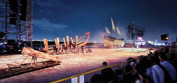 Và thêm nữa, hàng trăm nhân viên kỹ thuật, hướng dẫn viên và bảo vệ hùng hậu làm việc cật lực từ hơn mấy tháng trước. Tất cả cùng làm nên một “dạ tiệc” thịnh soạn của diễn xuất, ca vũ, âm nhạc, ánh sáng, mô hình, đạo cụ… Và ô hay, cả tàu thuyền qua lại sống động, cả lửa thật và lửa trong lòng, cả drone tân kỳ bay lượn tạo hình trên bầu trời.