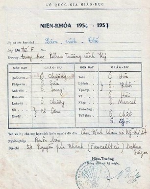 Xin gởi kèm đây hai tấm ảnh chụp từ cái Thông Tín Bạ của Lớp Đệ Tứ F, niên khóa 1956-1957 của Trường Petrus Ký mà tôi vẫn còn giữ được sau gần 70 năm, từ Việt Nam lưu lạc qua tới Canada. Nhìn kỹ các bạn sẽ thấy rõ Giáo Sư dạy môn Nhạc là Thầy Marcel (ảnh thứ nhứt), và trong bảng điểm thi của Đệ Nhứt Bán Niên thì KHÔNG có điểm ghi cho môn Nhạc (ảnh thứ nhì):