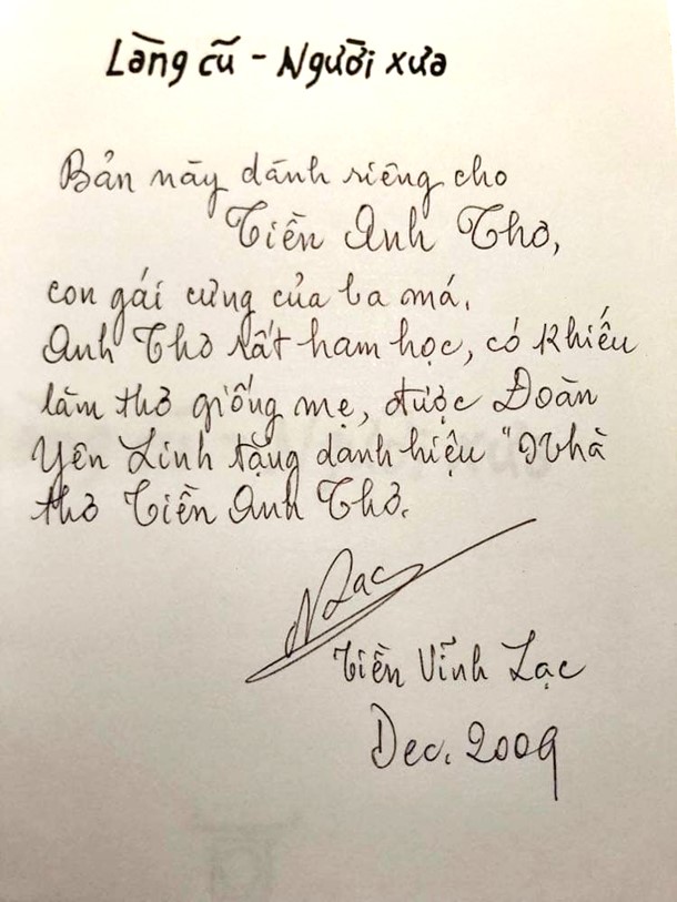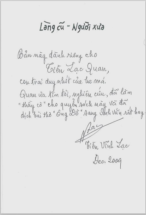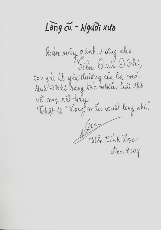 Viết trên trang bìa trong quyển sách đề tăng 3 người con: Tiền Lạc Quan, Tiền Anh Thơ và Tiền Anh Nhi.