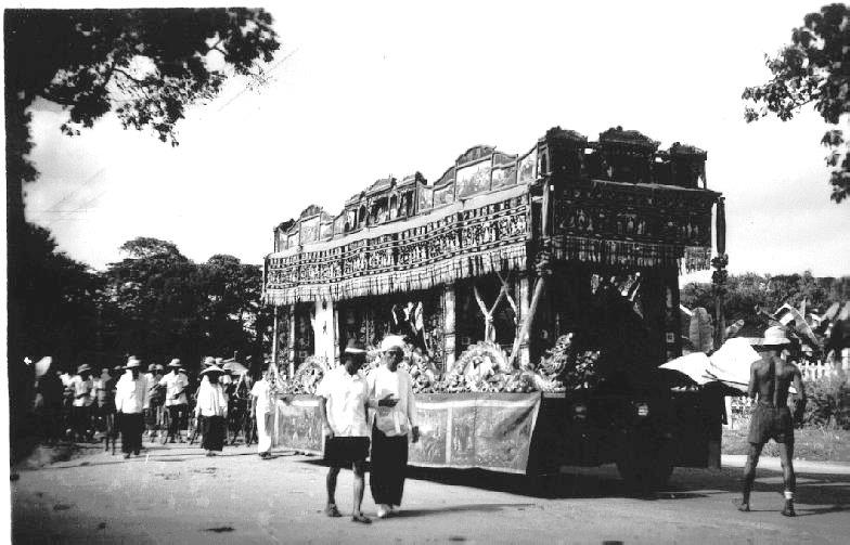 Đi đầu là tám thiếu niên cầm đuốc đi làm hai hàng, mỗi bên bốn cây đuốc. Đuốc làm bằng cây tre lớn bằng cườm tay, dài chừng hai thước tây, đầu cây tre cưa cách mắt tre chừng tám phân, chế dầu hôi vô rồi lấy vải trắng nút lại, vừa làm nút, vừa làm tim. Giữa hai hàng đuốc có một vị thầy mặc áo cà sa, đội mão tỳ lư, cỡi một con ngựa kim bước chẫm rãi, một tay cầm tích trượng, tay kia lần một xâu chuỗi lớn, miệng lâm râm niệm Phật. Theo sau có tám vị thầy cũng vừa đi vừa niệm Phật.
