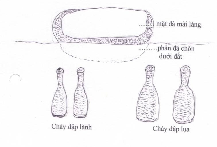 5/ Nhà đập: lợp mái ngói hoặc lá, không vách, dưới đất chôn những tảng đá mặt mài thật láng – láng như ván gõ – dùng để hàng lên đó mà đập. Đá chôn từng hàng dài, hàng này cách hàng kia đủ rộng để chừa chỗ cho thợ ngồi đập.