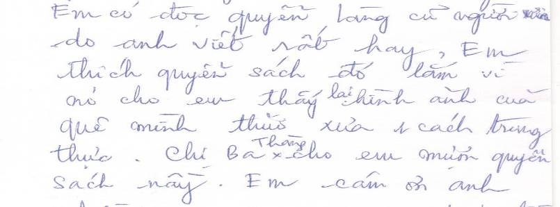 … Cả nhà em đọc sách “Làng Cũ Người Xưa” của anh gởi tặng hay quá! Em có cho những người bạn mượn đọc, ai cũng khen hay, trí nhớ của 1 cậu học sinh 9-10 tuổi rất tuyệt vời …