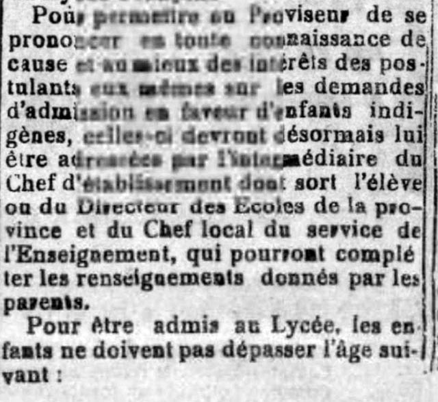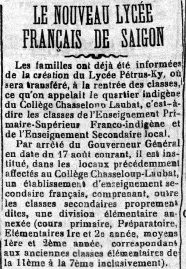 Les familles ont deja ete informees de la creation du Lycee Petrus Ky, ou sera transfere, a la rentree des classes, ce qu’on appelait le quartier indigene du College Chasseloup- Laubat, c’est -a -dire les classes de l’Enseignement Primaire- Superieur Franco-Indigene et de l’Enseignement Secondaire local.
