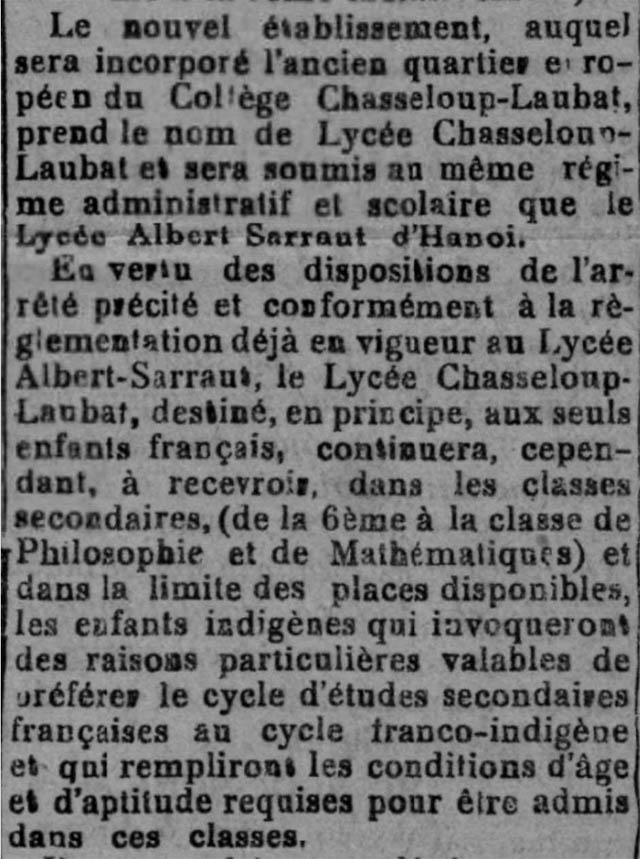 Le nouvel etablissement , auquel sera incorpore l’ ancien quartier europeen du College Chasseloup- Laubat , prend le nom de Lycee Chasseloup-Laubat et sera soumis au meme regime administratif et scolaire que le Lycee Albert Sarraut d’ Hanoi .