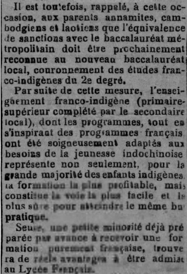 Tuy nhiên, nhắc lại nhơn dịp nầy, với các phụ huynh An Nam, Cao Mên, Lào, như sau, chế độ thi cử và tương đương văn bằng, so với tú tài chánh quốc sẽ được nhìn nhận trong thời gian tới, thành quả vinh danh bằng tú tài bản xứ.
