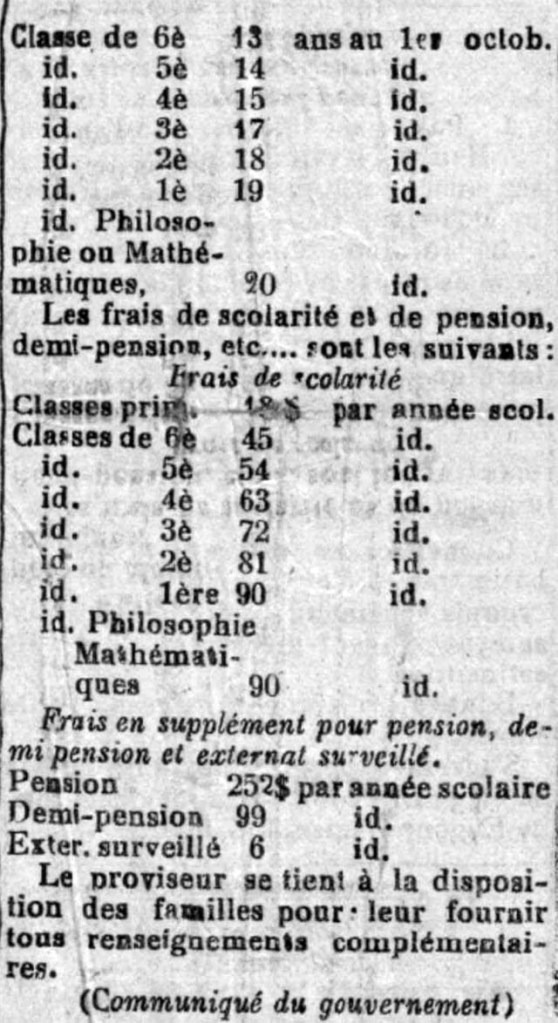 Par arrete du Gouverneur General en date du 17 Aout courant , il est institue , dans les locaux precedemment affectes au College Chasseloup-Laubat, un etablissement d’enseignement secondaire francais , comprenant outre les classes secondaires proprement dites , une division elementaire annexee ( cours primaire , Preparatoires Elementaires 1re et 2e annee, Moyens 1re et 2e annee, correspondant aux anciennes classes elementaires de la 11 eme a la 7eme inclusivement .