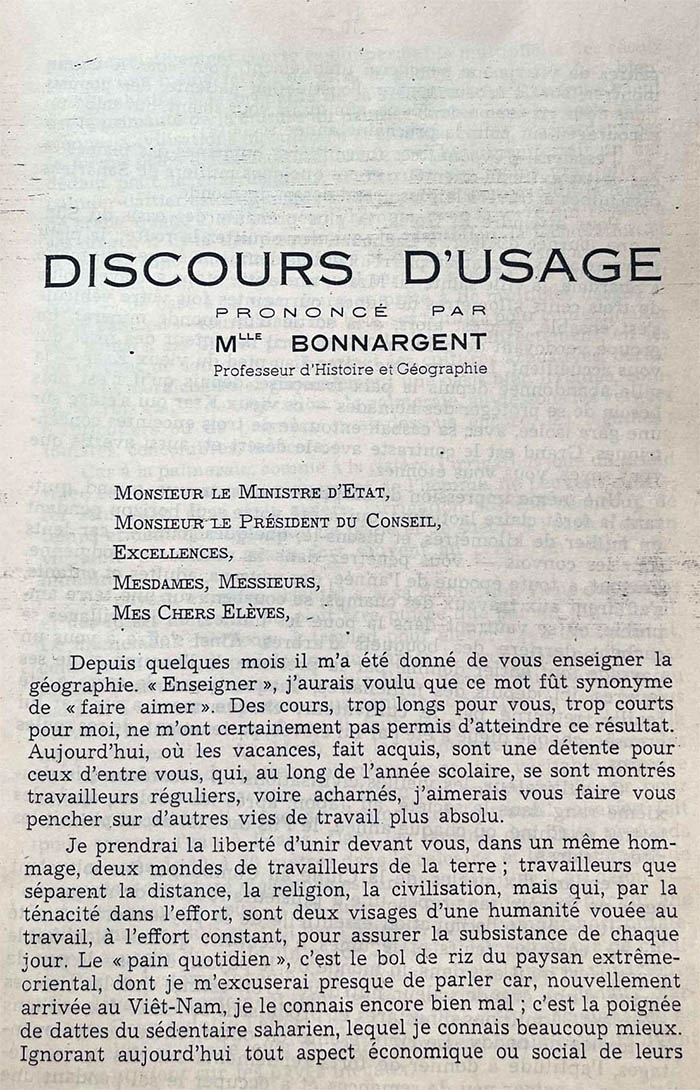 Diễn văn thường lệ của Cô Bonnargent – Giáo sư Sử Địa