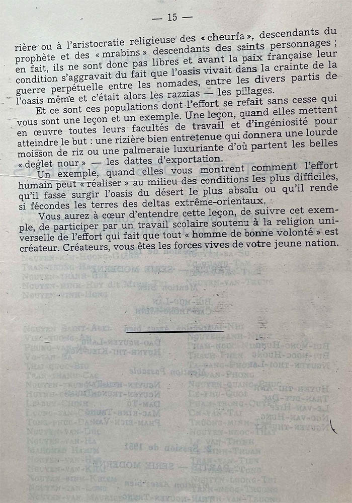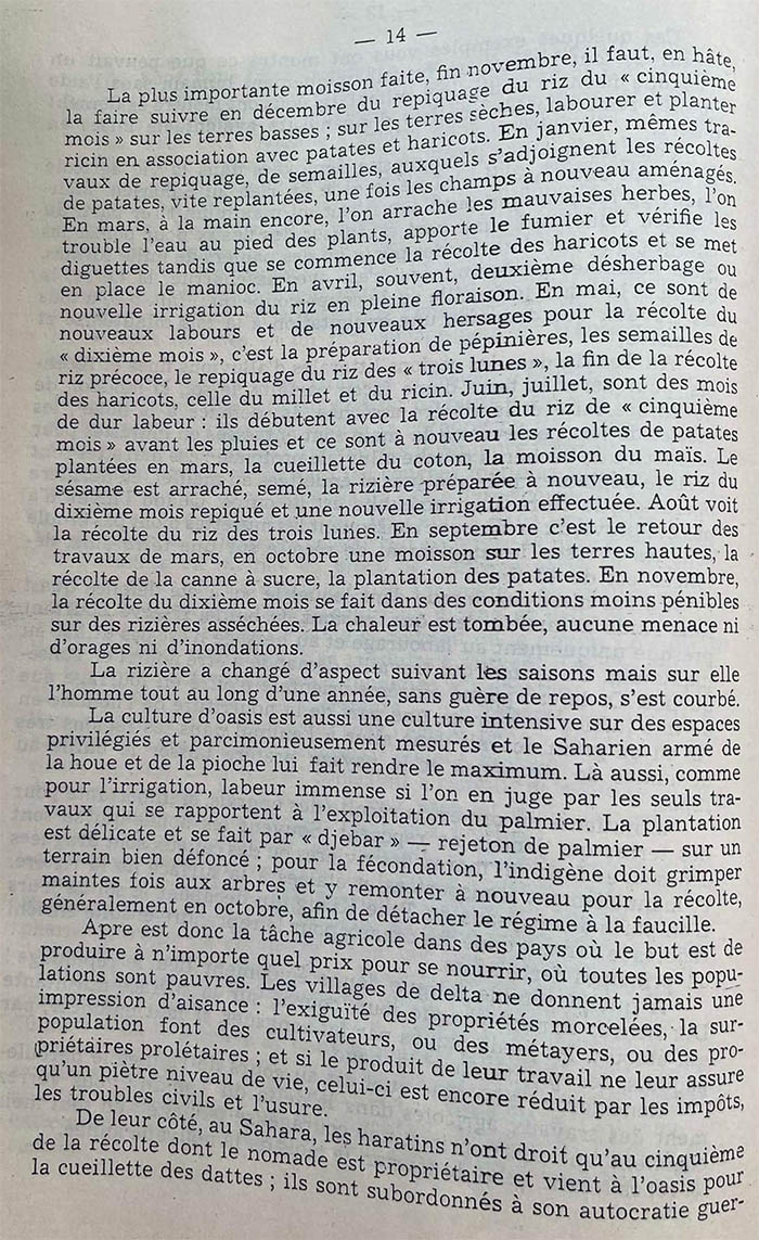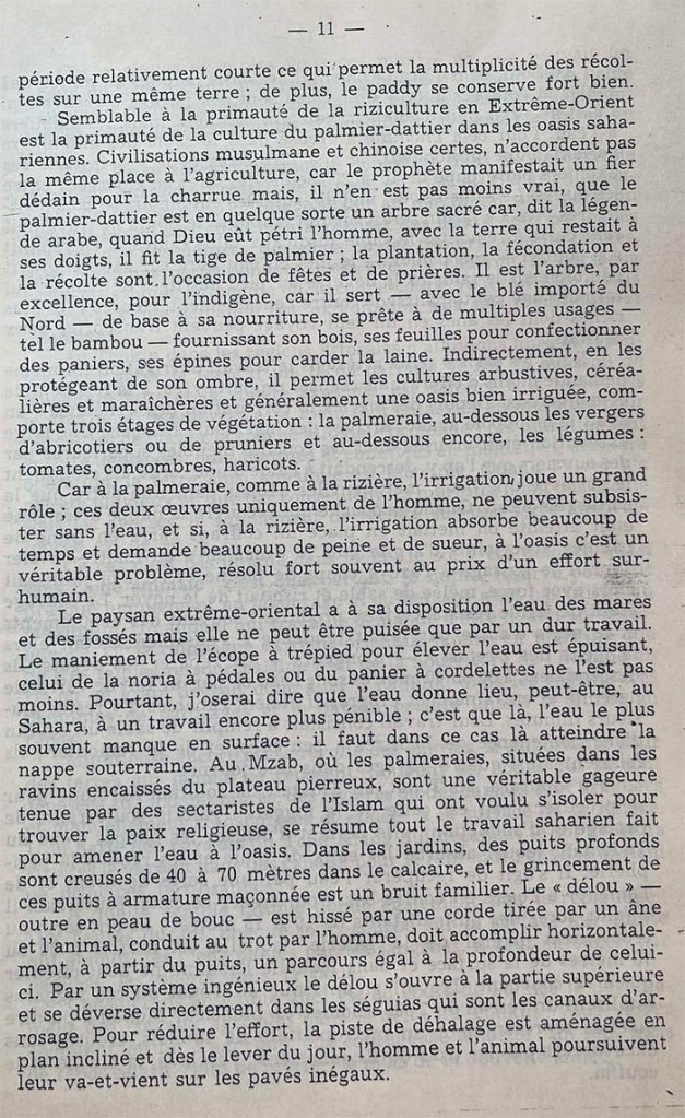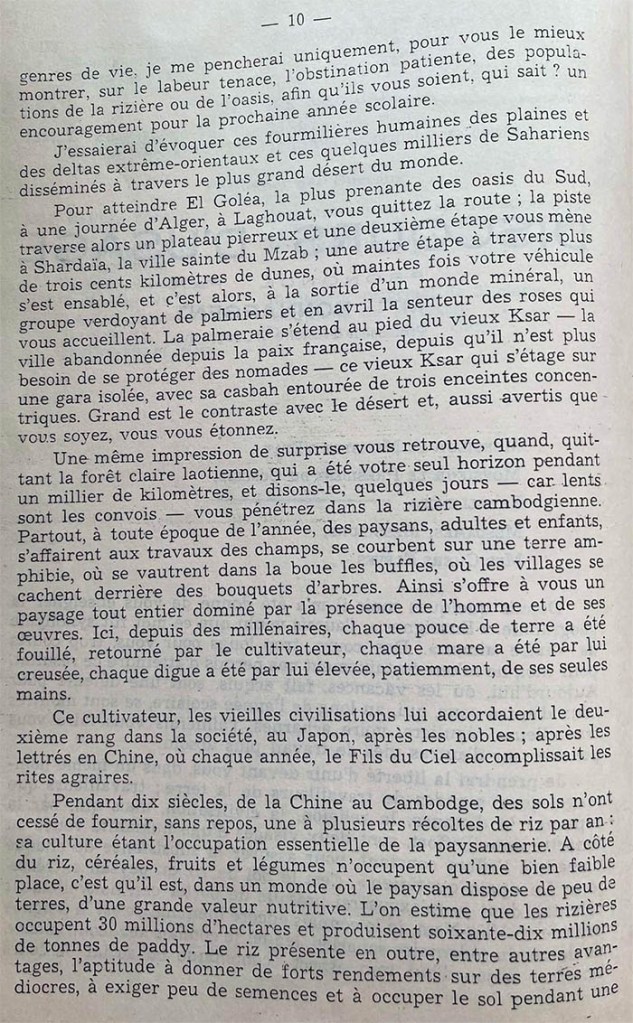 Hôm nay, bỏ qua tất cả tình trạng kinh tế, xã hội trong nếp sống của họ, tôi chỉ nhấn mạnh, để chỉ các em rõ hơn, tính kiên trì của lao động cực khổ, và tinh thần kiên định của nhà nông hay cư dân tại các ốc đảo. Như là một khích lệ cho các em, ai biết được?, trong năm sau.