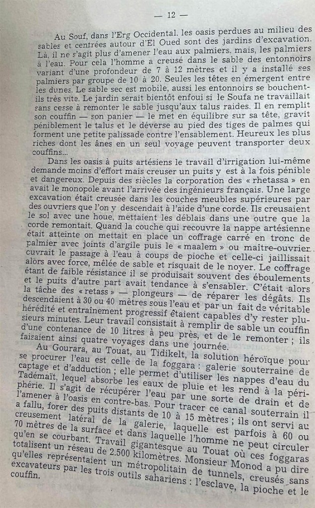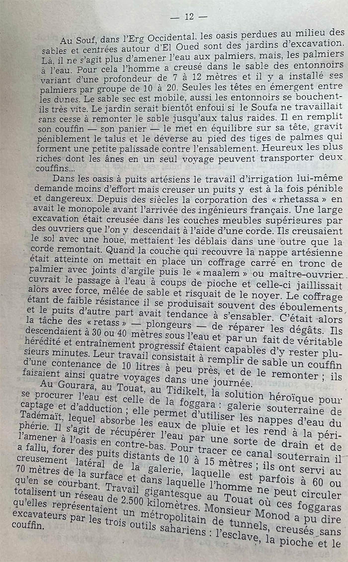 Để vẽ đường kênh ngầm này, phải đào các giếng cách nhau từ 10 đến 15 m cho phép đào ngang những hành lang sâu đến 60, 70 m mà con người chỉ có thể cong lưng di chuyển. Công tác to lớn ở Touat tổng cộng dài 2.500 km. Ông Monod có thể tuyên bố rằng hệ thống đường hầm xe điện ngầm không bằng máy đào với ba dụng cụ thuộc của Sahara là: nô lệ , len cuốc , nôi giỏ tải đất.