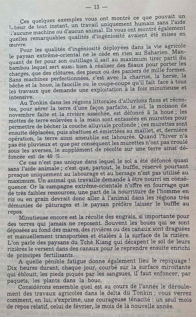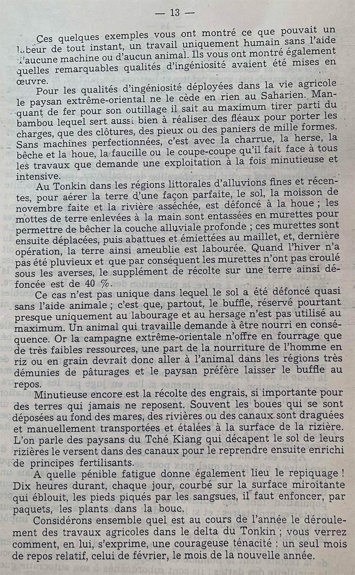 Nơi đây, từ bao ngàn năm, mỗi tất đất được bươi móc, cuốc xới bởi người nông dân, mỗi cái ao được đào, mỗi cái đê được nâng lên, bởi duy nhứt bằng bàn tay nhẫn nại của họ.