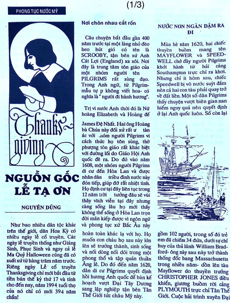 Bài viết về Lễ Tạ Ơn sau đây đã được viết cách đây 31 năm (1994) và đã được đăng trên các báo Việt ngữ ở Nam Cali dạo ấy. Vì thời gian gấp rút, người viết không kịp đánh lại và thêm vài hình màu cho hoàn chỉnh hơn, mong độc giả thông cảm…