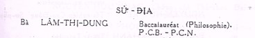 4. Cuốn Kỷ Yếu Lễ Phát Thưởng của Trường Petrus Ký năm 1960 (tức là 6 năm sau niên khóa 1954-1955 này, lúc tôi đã học xong Lớp Đệ Nhứt A1, và đang chuẩn bị thi Bằng Tú Tài 2) ghi rõ là Cô Lâm Thị Dung chỉ có Bằng Tú Tài 2 Pháp, Ban Triết (Philosophie), và 2 Chứng chỉ của Trường Đại Học Khoa Học Sài Gòn là P.C.B (Physique-Chimie-Biologie = Lý Hóa Sinh) và P.C.N. (chi tiết này nhà Trường đã ghi sai, đúng ra phải ghi là S.P.C.N. = Sciences: Physique, Chimique et Naturelle = Các Khoa Học Lý Hóa và Thiên Nhiên) như sau:
