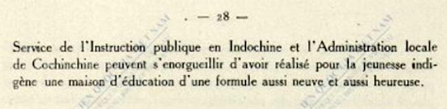 Ban học vụ công lập Đông Dương và chánh quyền địa phương Nam kỳ có thể hãnh diện đã hoàn thành cho tuổi trẻ bản xứ một ngôi nhà giáo dục tân tiến và hạnh phúc.