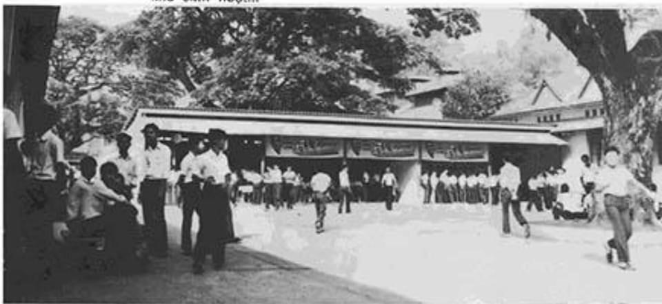 Hình 9. Bên trong khu Sinh Hoạt Học Đường năm 1972 với nơi bán nước giải khát và thức ăn nhẹ cho học sinh, toà nhà bên mặt, phía sau cây cổ thụ, là thư viện trường Petrus Trương Vĩnh Ký.