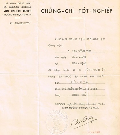 Chứng chỉ tốt nghiệp ĐHSPSG do GS Khoa Trưởng Bùi Xuân Bào ký ngày 24-4-1963