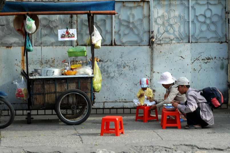 Hai người quen nhau vì đều ra phụ chạy bàn vào ngày Chủ Nhật. “Em giúp ba em. Tôi giúp má tôi.” Chàng tán tỉnh nàng, nhưng nàng sợ cha nàng không bằng lòng. Vì theo cha nàng: “Con trai Việt Nam làm biếng lắm, đi chơi tối ngày, không lo buôn bán. Không buôn bán lấy gì ăn. Không có gì ăn, làm sao lấy vợ. Nếu lấy được vợ làm sao nuôi vợ, nuôi con.” Mặc! Chàng tán riết, nàng xiêu lòng.