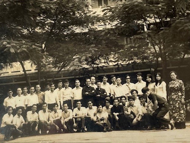 Ảnh kỉ niệm toàn thể GS Trung học Monica – Gia Kiệm Long Khánh dịp tiễn LM HT Phạm Văn Phương du học Hoa Kỳ năm 1972 – (Cha Phương đứng cao ở giữa – bên phải là thầy giám học Trần Văn Huyến và canh đó Phan Văn Thạnh)
