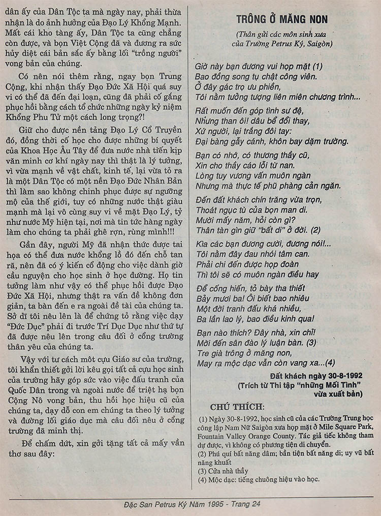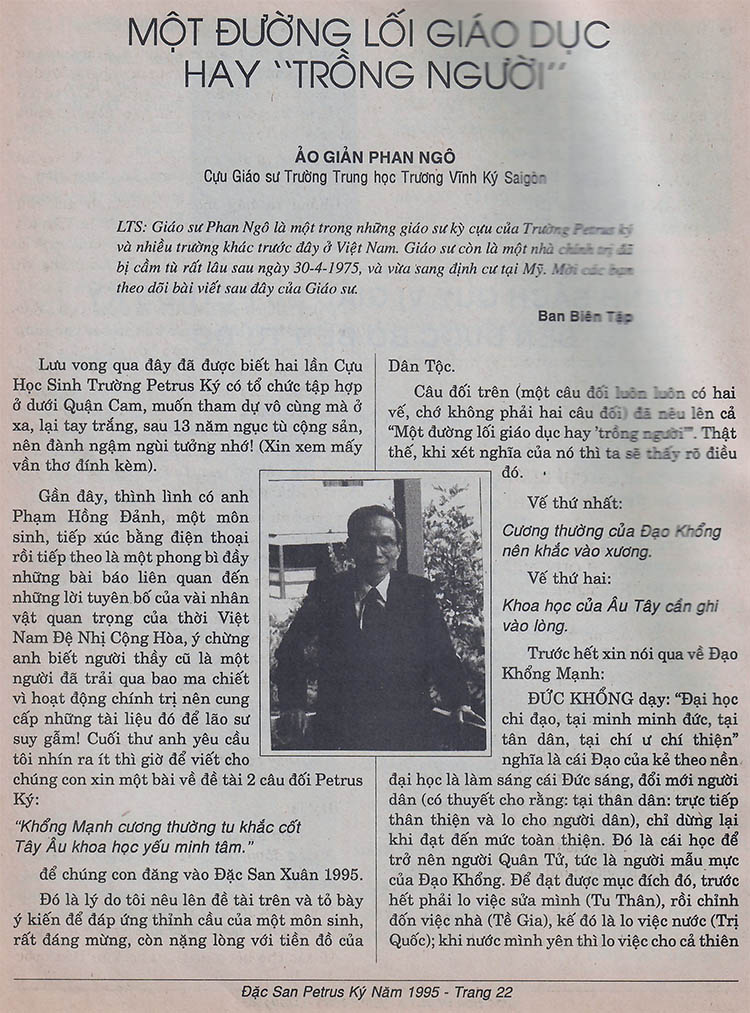 Một đường lối giáo dục hay “trồng người” GS Phan Ngô (Nguồn: Đặc san Petrus Ký Nam Cali năm 1995) Share this: Share on X (Opens in new window) X Share on Facebook (Opens in new window) Facebook Like Loading...