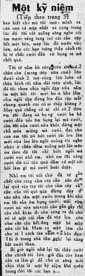 Tôi té nằm bò càng trên sình á, hai chân còn (mang dép nữa chứ) lún dưới sình, hai tay cũng lún luôn, cả thân hình tôi nằm dài trên sình, lúc đó tôi chưa chịu ngồi dậy nữa nằm im một hồi tôi mới hoàn hồn lồm cồm ngồi dậy đứng lên đảo cặp mắt chung quanh coi ai có thấy không ? May quá chẳng có ai, chỉ có hai đứa em tôi đang hả họng cười ha hả, cười đến nỗi ôm bụng lại mà cười, còn tôi nửa cười nửa khóc đứng một chỗ méo miệng mà cười, đợi cho con em tôi nó bớt cười tôi leo lên, mới vừa leo lên ngồi xuống tôi nghe nhức ở chân, dòm xuống một lằn máu ứa theo chỗ đó, tôi chỉ biết ngồi mà cười với nhỏ em, nhỏ em tôi càng cười dữ, tôi tức quá đấm nó một cái hỏi làm gì mà cười hoài dzậy.