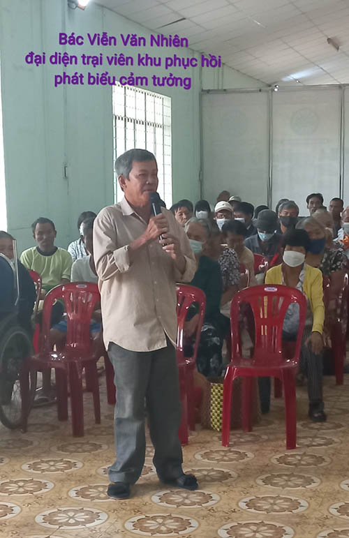 Thật cảm động khi có một bác trại viên (thuộc khu phục hồi) tên Viễn Văn Nhiên, bắt đầu vào trại ở từ năm 1976 (17 tuổi) gắn bó gần hết cả cuộc đời ở đây cho đến nay đã 64 tuổi lên phát biểu ý kiến và cảm tưởng về những ân tình, đầy lòng bác ái nhân hậu của các ân nhân trong và ngoài nước, thường xuyên và lâu dài nhất là các Ân nhân từ tâm thiện nguyện Úc châu đã dành cho Bến Sắn sự giúp đỡ ổn định hàng năm và tình yêu thương của BGĐ trại nhất là các Sơ.