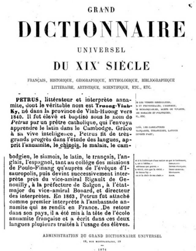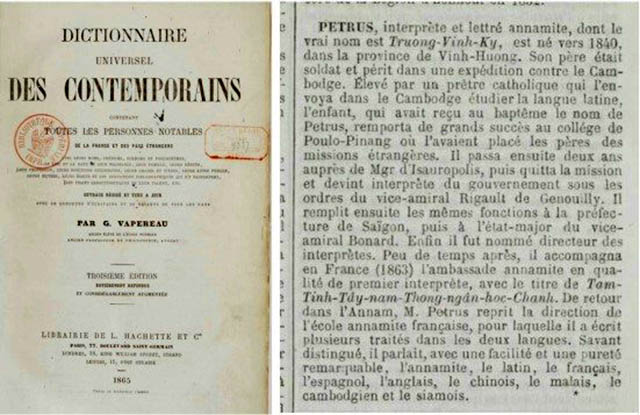 Như tên gọi của nó, Dictionnaire universel des Contemporains là từ điển giới thiệu các nhân vật nổi tiếng đương thời trên thế giới, được Hachette xuất bản tại Paris. Lần xuất bản thứ ba năm 1865, từ điển này đã giới thiệu Trương Vĩnh Ký lúc ấy ông mới 27 tuổi, ở mục từ PETRUS (tr. 1411) như hình bên dưới: