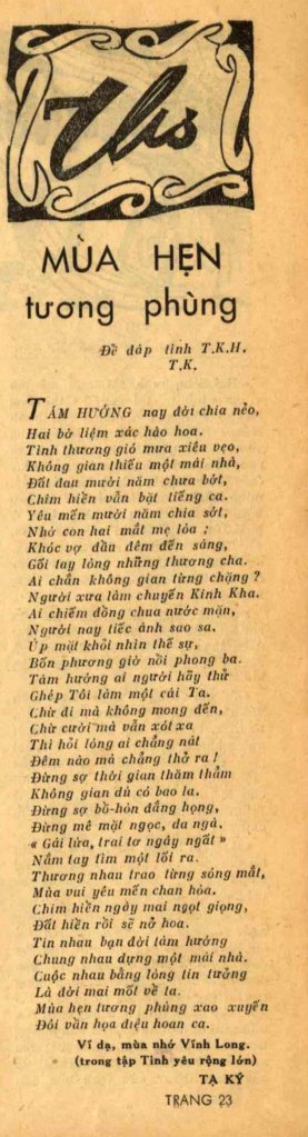Mùa hẹn tương phùng Để đáp tình T. K. H. Tạ Ký (nguồn: tuần báo Đời Mới số 164, ngày 24-4-1955) Võ Phi Hùng sưu tập Share this: Click to share on X (Opens in new window) X Click to share on Facebook (Opens in new window) Facebook Like Loading...