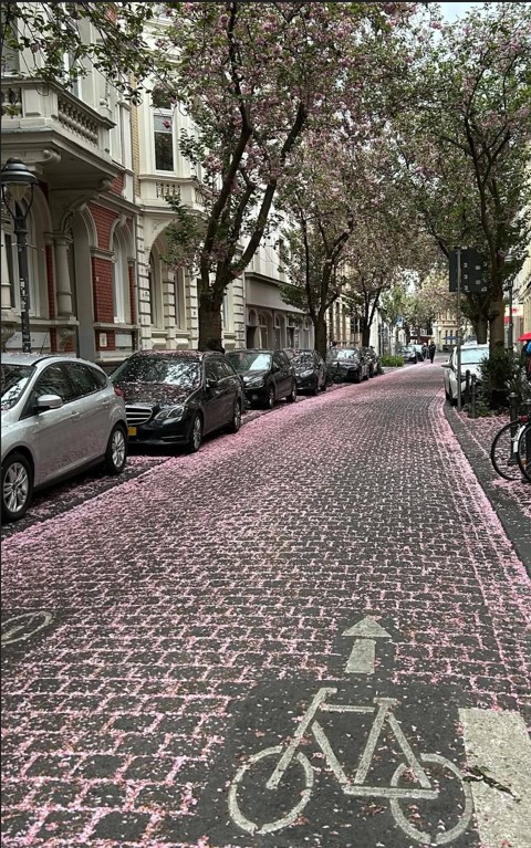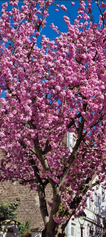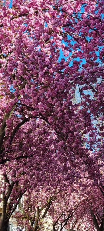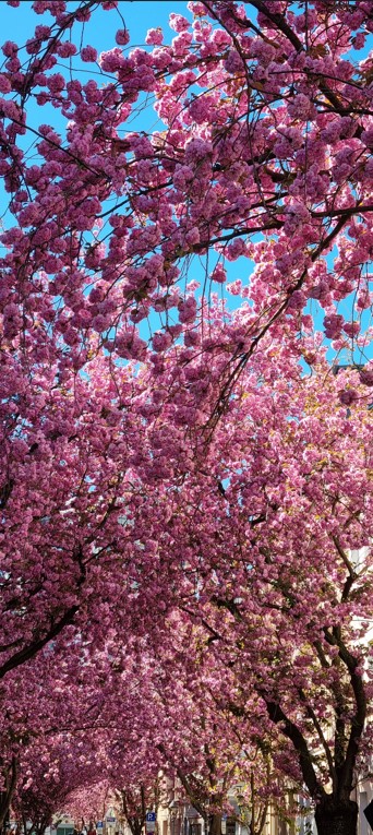 Không đợi đến ngày cuối tuần, khách nhàn du khắp nơi đổ xô về đây để đi dạo trên con phố cổ lung linh hàng trăm gốc anh đào có nguồn gốc từ xứ sở Phù-Tang. Họ chen chân nhau trên con phố hẹp vốn dĩ vắng vẻ và yên tĩnh bốn mùa. Để cho mọi người có thể thưởng lãm trọn vẹn nên sở giao thông đã ban lệnh cho xe cộ không được phép lưu thông trong khoảng thời gian hoa anh đào khoe sắc. Trẻ già, trai gái như đang trong mùa trẩy hội khi mùa xuân đến sớm và mùa đông chợt giã từ hôm cuối tháng ba. Họ chụp rất nhiều hình ảnh để lưu niệm như sợ xuân tàn và âu lo những chùm hoa anh đào sẽ chóng phôi phai sắc thắm. Điệu nhạc Samba rộn rã trổi lên từ cái loa phóng thanh đi động của một khách lãng du. Không ai bảo ai, thiên hạ chuyền tay nhảy nhót, múa may giữa bầu trời xuân nhuộm màu hồng thắm. Vui xuân cho khéo kẻo xuân chóng tàn. Đâu đó, tiếng chim lảnh lót hót vang khiến cho mùa xuân mới thêm phần thi vị.