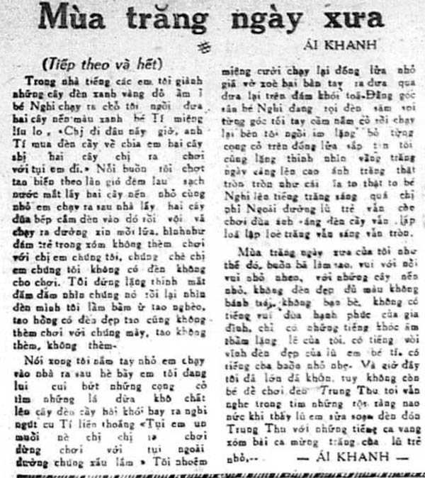 Mùa trăng ngày xưa của tôi như thế đó, buồn bã làm sao, vui với nỗi vui nhỏ nhen, với những cây nến nhỏ, không đèn đẹp đủ màu, không bánh trái, không bạn bè, không có tiếng vui đùa hạnh phúc của gia đình, chỉ có tiếng khóc âm thầm lặng lẽ của tôi, có tiếng vòi vĩnh đèn đẹp của lũ em bé tí, có tiếng cha buồn nhỏ nhẹ. Và giờ đây tôi đã lớn khôn, tuy không còn bé để chơi đèn Trung thu tôi vẫn nghe trong tim những rộn ràng náo nức khi thấy lũ em sửa soạn đèn đón Trung Thu với những tiếng ca vang xóm, bài ca mừng trăng thu của lũ trẻ nhỏ…