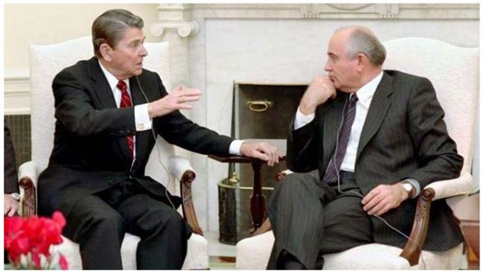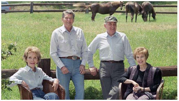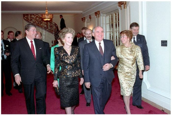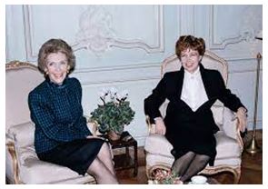 Hai phu nhân Nancy Reagan và Raisa Gorbachev lần đầu tiên gặp nhau, ngồi uống trà nói chuyện vui vẻ tại Geneva, Thụy Sĩ (1985) trong khi hai phu quân đang bàn chuyện giảm vũ khí nguyên tử cho đôi bên.
