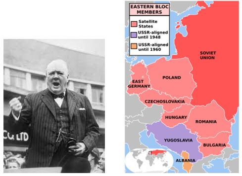 Winston Churchill với diễn văn bất hủ “Behind the iron curtain” bao gồm Liên Xô (Soviet Union) và các nước Đông Âu (màu hồng). Chỉ có Nam Tư (Yugoslavia) và Albania thoát khỏi nanh vuốt Liên Xô.