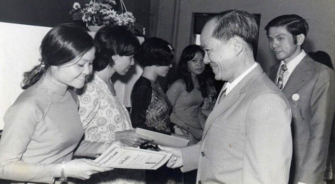 Giáo sư Nguyễn Ngọc Huy, Viện Trưởng Viện Đại Học Sài Gòn, trao Chứng Chỉ Tốt Nghiệp cho Học viên Khóa Huấn Luyện