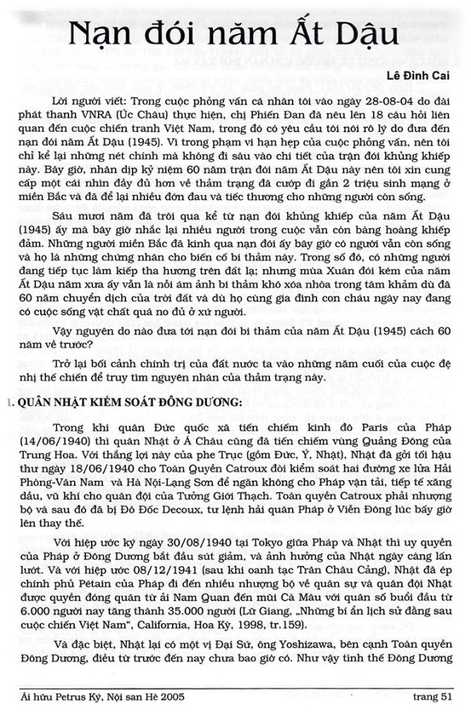 Nạn đói năm Ất Dậu – Lê Đình Cai (Nguồn: Nội san Hè 2005, Hội Ái hữu Trung học Petrus Trương Vĩnh Ký tại Pháp) Share this: Click to share on X (Opens in new window) X Click to share on Facebook (Opens in new window) Facebook Like Loading...