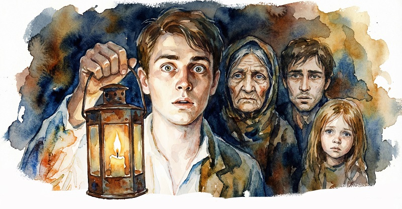 Chưa kịp định thần, anh lại gặp một thân hình gục trong máng xối – dưới ánh nến, đó chính là người anh ruột Elin! Thomas cuống cuồng bế dậy, tìm đến quán trọ cầu cứu. Bà chủ trọ lạnh lùng đòi một shilling. Anh chẳng còn gì ngoài 6 xu, đành dâng cả ba lô cùng số tiền ít ỏi để đổi lấy chỗ trú cho anh mình. Nhưng khi quay lại, gương mặt ấy lại biến thành kẻ ăn mày lạ hoắc. Bị đẩy ra đường, Thomas ngơ ngác tự hỏi: phải chăng ánh sáng này đang đùa cợt mình?