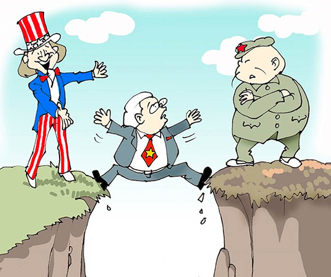 Như Kiều đã ba chìm bảy nổi chốn lầu xanh, (thời mình nổi danh Ngã Ba Chú Ía), phục vụ cho nhiều khách làng chơi. Hết Nga, tới Tàu, giờ tới Chú Sam là khách sộp nhứt. CSVN tính lại chơi chiêu của Tú Bà: ‘Ðưa người cửa trước rước người cửa sau’ như trước tới giờ. Nhưng lần nầy, Chú Sam có vẻ quyết liệt quá. ‘Người ấy và ta em chọn ai?’