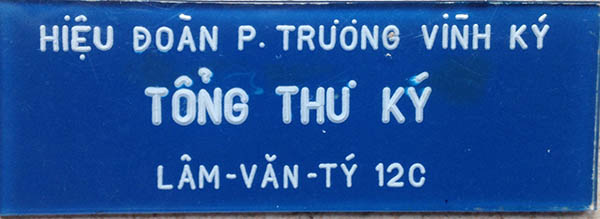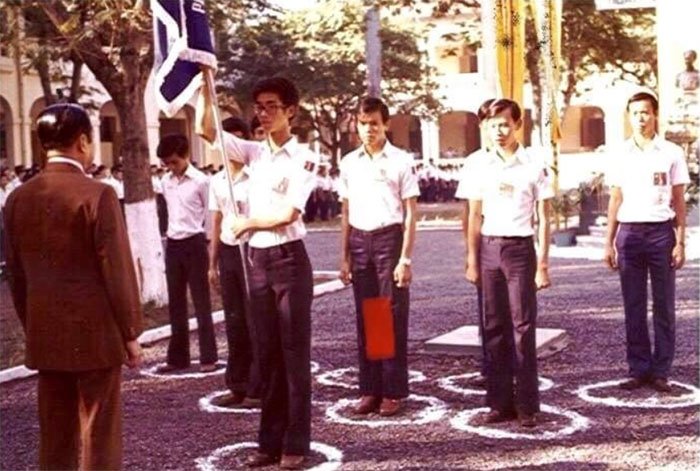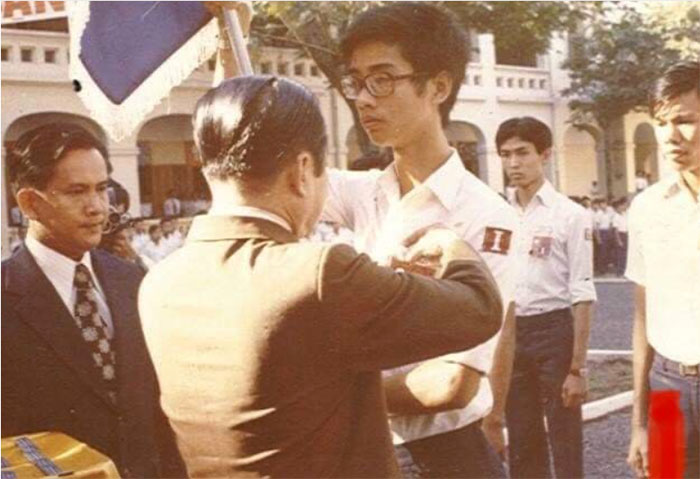 Hình 3: Ông Ngô Khắc Tỉnh, Tổng trưởng bộ Văn Hoá Giáo Dục và Thanh Niên, trao huy hiệu Tổng Thư Ký cho anh Lâm Văn Tý, người đang cầm cờ hiệu đoàn, và phía bên trái là thầy Hiệu trưởng Nguyễn Minh Đức. (Huy hiệu làm bằng formica có khắc tên trường, tên người, chức vụ và niên khóa trên nền xanh dương cho người TTK và các trưởng khối, sau lưng có kim cài để khi đi sinh hoạt chính thức của trường mọi người mang để nhận diện là ban đại diện của trường)