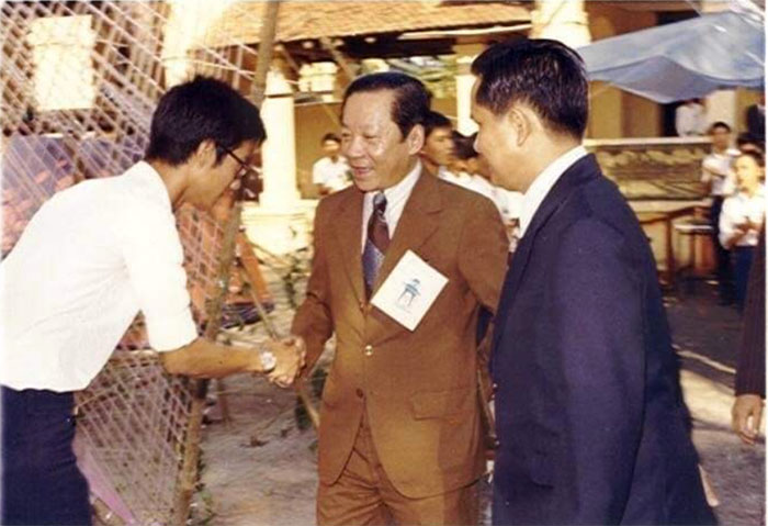 Hình 5: Anh Lâm Văn Tý đang chào mừng ông Tổng trưởng VH-GĐ-TN Ngô Khắc Tỉnh đến chủ tọa ngày Truyền thống , cùng với thầy Hiệu trưởng Nguyễn Minh Đức.