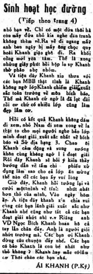 Hồi có kết quả Khanh không dám đi xem, nhỏ Nam đi xem xong về la thật to cho mọi người nghe, bảo lớp mình đoạt giải xuất sắc về Bích Báo và Sử Địa hạng 3. Chao ôi! Khanh cảm động và sung sướng khôn cùng, không ngờ lại đoạt giải. Rồi đây Khanh sẽ hỏi ý kiến thầy hướng dẫn về tấm chi phiếu xử dụng làm sao cho cả lớp ăn mừng thế nào để các bạn ấy vui lòng.