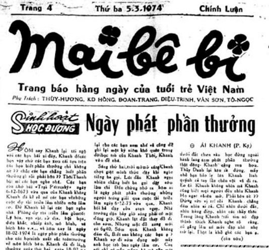 Hồi có kết quả Khanh không dám đi xem, nhỏ Nam đi xem xong về la thật to cho mọi người nghe, bảo lớp mình đoạt giải xuất sắc về Bích Báo và Sử Địa hạng 3. Chao ôi! Khanh cảm động và sung sướng khôn cùng, không ngờ lại đoạt giải. Rồi đây Khanh sẽ hỏi ý kiến thầy hướng dẫn về tấm chi phiếu xử dụng làm sao cho cả lớp ăn mừng thế nào để các bạn ấy vui lòng.