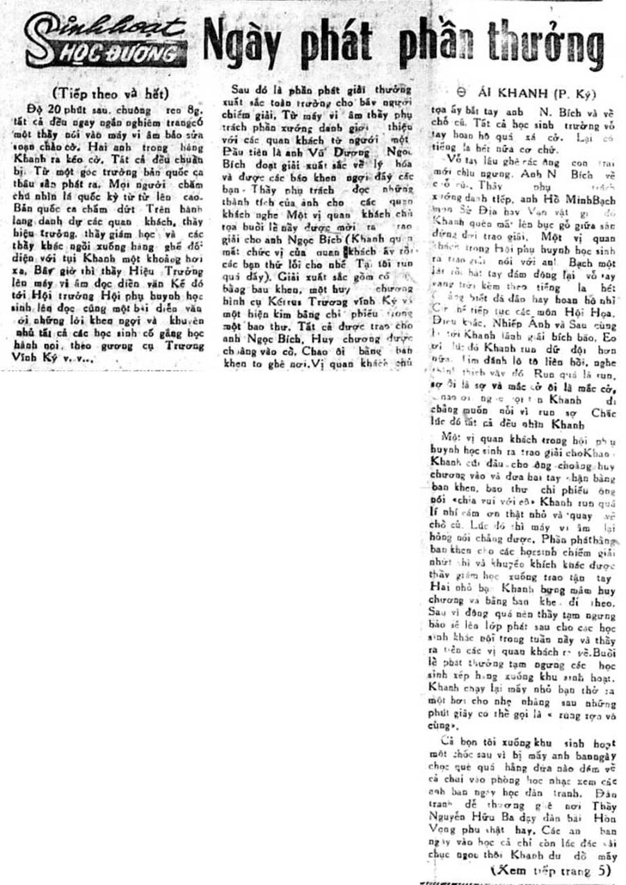 Vỗ tay lâu ghê các ông con trai mới chịu ngưng. Anh N. Bích về chỗ cũ. Thầy phụ trách xướng danh tiếp, anh Hồ Minh Bạch môn Sử Địa hay Vạn Vật gì đó, Khanh quên mất, lên bục gỗ giữa sân đứng đợi trao giải. Một vị quan khách trong hội Phụ huynh học sinh ra trao giải nói với anh Bạch một lát rồi bắt tay, đám đông lại vỗ tay vang trời kèm theo tiếng la hét, chẳng biết đả đảo hay hoan hô nhỉ. Cứ thế tiếp tục các môn Hôi Hoạ, Điêu Khắc, Nhiếp Ảnh và sau cùng là tới Khanh lãnh giải Bích Báo. Eo ơi, lúc đó Khanh run dữ dội hơn nữa. Tim đánh lô tô liên hồi, nghe thình thịch vậy đó. Run quá là run, sợ ơi là sợ và mắc cở ôi là mắc cở. Chao ôi, nghe gọi tên Khanh đi chẳng muốn nỗi vì run sợ. Chắc lúc đó tất cả đều nhìn Khanh.