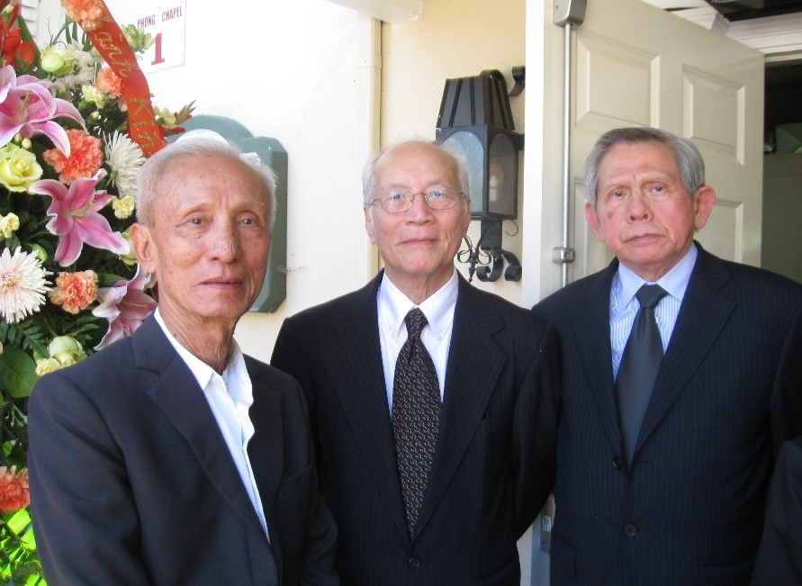 Hình chụp tại đám tang Thầy Bùi Trọng Chương – Từ trái qua: bạn Trần Phục (bạn học của tôi, Lớp Đệ Tứ F, niên khóa 1956-1957), Thầy Lê Xuân Khoa, và tôi.