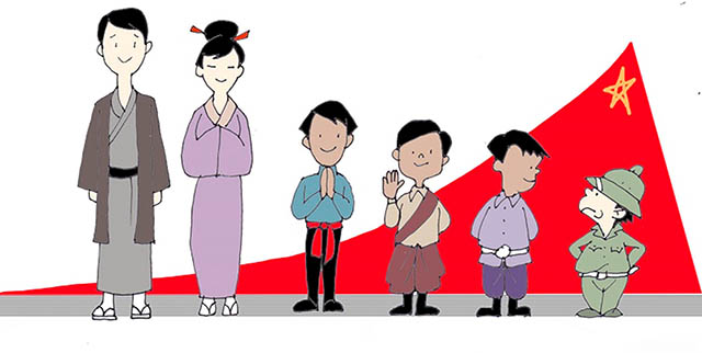 Nhựt Bổn hồi năm 45, lúc xâm chiếm nước ta, sĩ quan Nhựt đeo cây kiếm bên hông cho oai, đi là phải vén kiếm lên, kẻo quét đất! Tụi phát xít Nhựt dẫu hung hăng nhưng còn lùn hơn dân Việt mình thuở đó. Sau khi thất trận, kinh tế Nhựt tanh bành ráo trọi! Vậy mà chỉ trong vòng có 40 năm, dân Nhựt đã cao lên 10cm, đạt mức 172cm với nam và 158cm với nữ, Nhựt chỉ thua thế giới có 5 cm. So với Việt Nam, đàn ông Nhựt cao hơn 8.3cm; đàn bà Nhựt cao hơn 4cm).