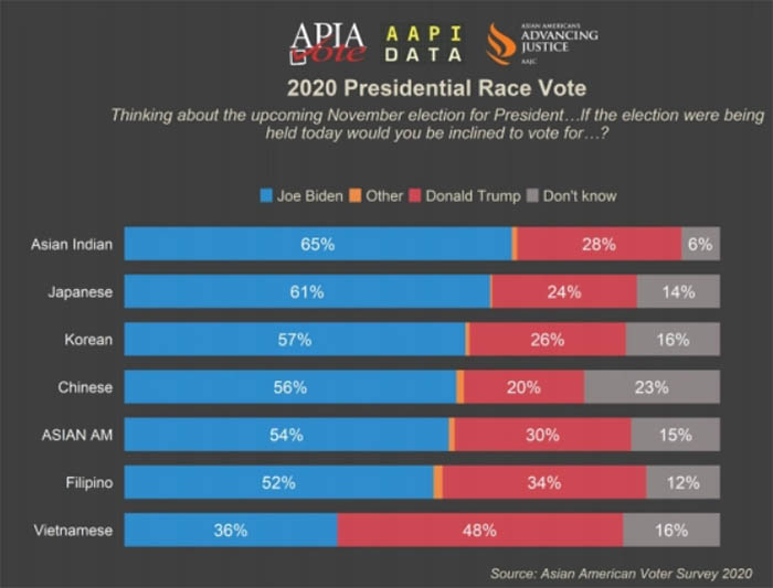 Theo VoteCast, một cuộc khảo sát với hơn 110.000 cử tri trên toàn quốc do NORC tại Đại học Chicago thực hiện cho Associated Press thì có ½ dân thiên Chúa giáo người Mỹ ủng hộ ông Trump. Cạnh đó là một tập hợp nhỏ hơn nhiều, đó là đa số người Mỹ gốc Việt – họ tách rời khỏi khối người Mỹ gốc châu Á về mức ủng hộ ông Trump. Thăm dò năm 2020 của APIA cho thấy người Mỹ gốc Việt ủng hộ Trump (48%) nhiều hơn ủng hộ Biden (36%) và nhiều hơn tất cả các sắc dân Mỹ gốc châu Á khác. 38% coi họ thuộc đảng Cộng Hòa, 24% là cử tri độc lập, và 27% xem họ thuộc đảng Dân chủ. 45% bầu cho ứng viên đảng Cộng hòa ở Hạ viện, 32% bầu cho ứng viên đảng Dân chủ. 56% bầu cho ứng viên đảng Cộng hòa ở Thượng viện, 23% bầu cho ứng viên đảng Dân chủ ở Thượng viện.