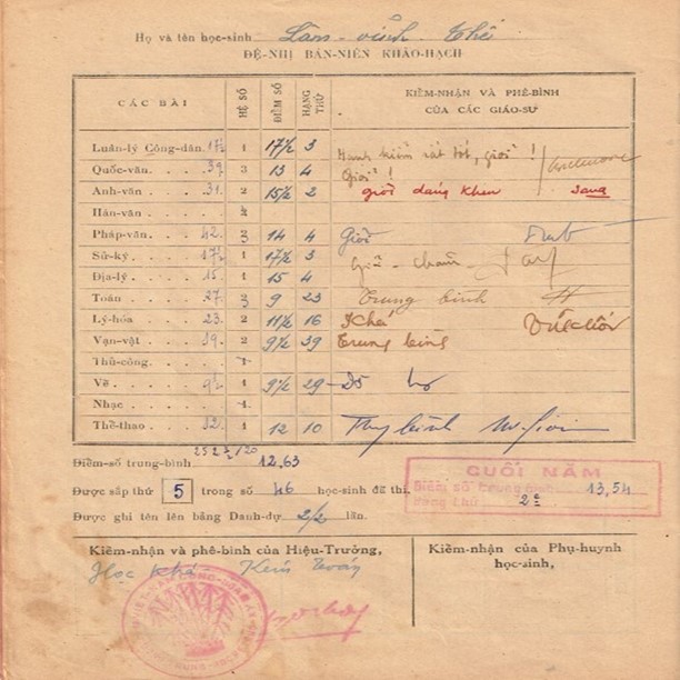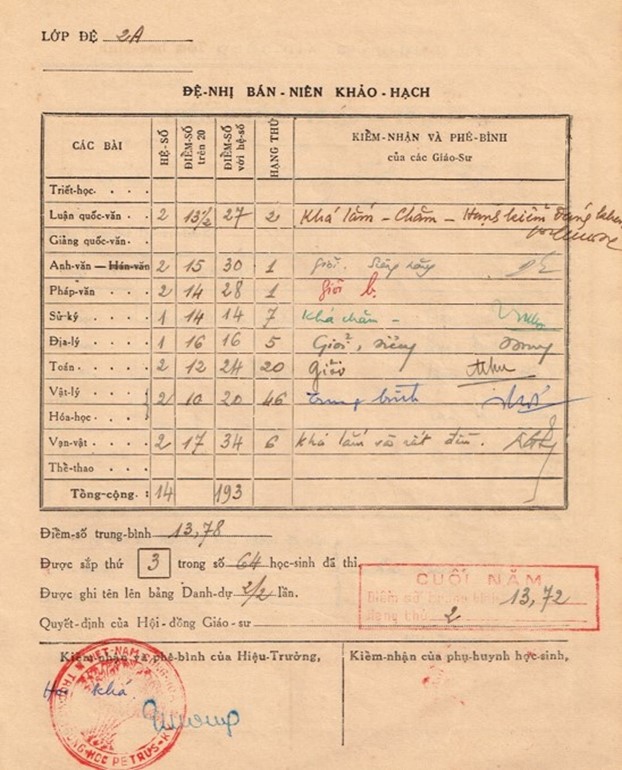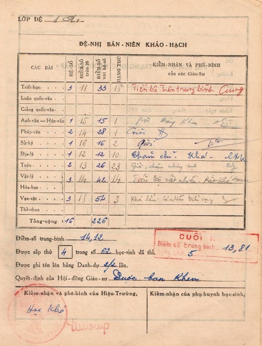 Dưới đây là ảnh chụp điểm thi của Đệ Nhị Bán Niên, có ghi rõ hạng thứ cho toàn năm, của 3 năm học Đệ Tứ F, Đệ Nhị A, và Đệ Nhứt A1 của tác giả bài viết này: