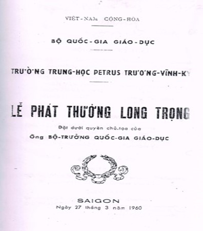 Dươi đây là ảnh chụp trang bìa trước của quyển kỷ yếu Lễ Phát Thưởng Long Trọng đặt dưới quyền chủ tọa của Ông Bộ Trưởng Quốc Gia Giáo Dục, năm 1960:
