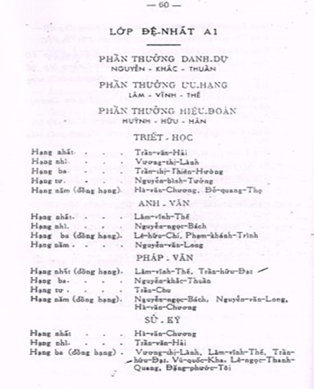 Phần Thưởng Ưu Hạng của Lớp Đệ Nhứt A1 (Niên Khóa 1959-1960): học sinh Lâm Vĩnh Thế