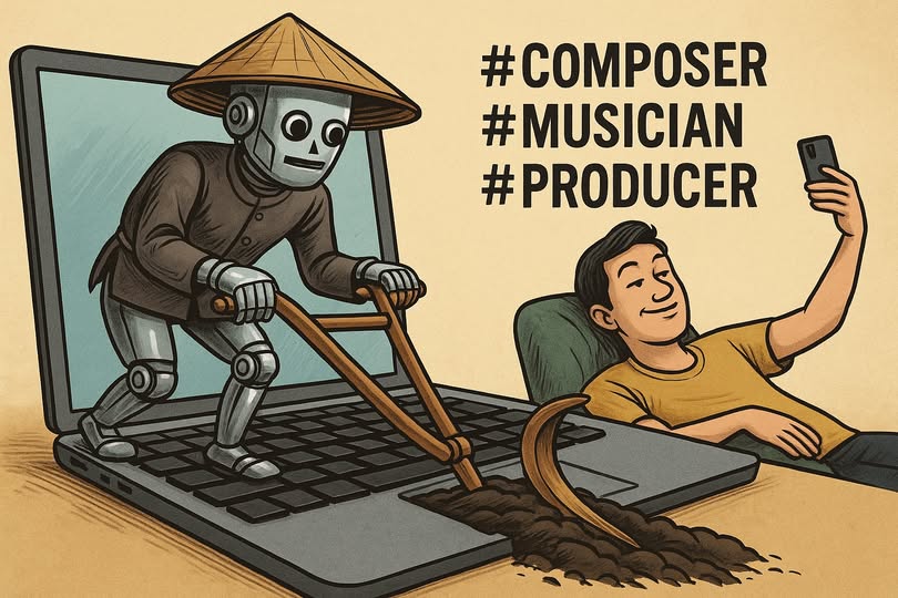 Từ đó, nhà nhà sáng tác, người người thành nhạc sĩ. Nhìn YouTube, thấy cả ngàn bản nhạc “AI Original” mà tác giả nhiều khi một nốt nhạc cắn đôi cũng không biết, nhưng profile ghi rõ ràng: “Composer / Producer / Music Creator.”