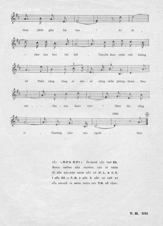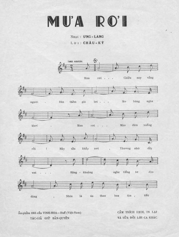 (*) “Mưa rơi” là nỗi sầu muôn thuở của nhạc sĩ Ưng Lang và được ông sáng tác từ nét nhạc đến lời ca, tuy trên ấn phẩm của nhà xuất bản Tinh Hoa năm 1955 ghi “lời nhạc của Châu Kỳ”. Theo lời Ưng Lang thì khoảng thời gian sau đó không lâu, nhạc sĩ Châu Kỳ là người em và cũng là người bạn văn nghệ ở Huế đang lâm lụy sau cuộc hôn nhân tan vỡ. Nhạc sĩ Châu Kỳ xin được thay đổi vài chỗ trong lời hát với hy vọng gửi gắm ít nhiều tâm sự đến người xưa nên Ưng Lang đã đồng ý để tên Châu Kỳ trên ‘sheet’ nhạc.