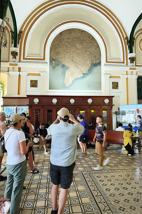 Các cơ quan chính quyền phải truyền dẫn thông tin và cảm hứng về không gian mới của các tỉnh, thành hợp nhất. Trong ảnh: Du khách nước ngoài thưởng ngoạn bản đồ Nam bộ tại Bưu điện trung tâm Sài Gòn