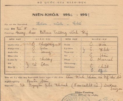 Mùa Thu năm 1956, tôi lên Lớp Đệ Tứ F và được học với các Thầy Cô sau đây: