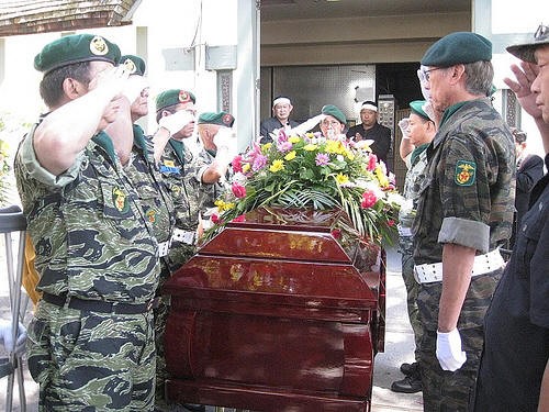 Các quân nhân TQLC VNCH chào kính trước khi làm lễ di quan tại đám tang của Lãm